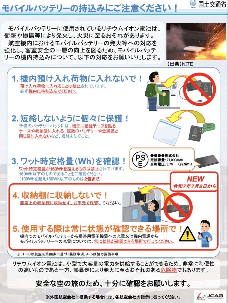 国土交通省から、「モバイルバッテリーの持込みにご注意ください」というお知らせが発表されていますのでご覧くださいね。